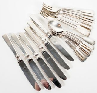 Manuf Robbe & Berking/Flensburg, für 6 bzw 9 Personen, 3tlg., Altspatendekor, MZ, Beschau, zus ca 400gr 800er Silber (ohne Messer gewogen)
