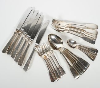 Manuf. Robbe & Berking/Flensburg, Spatendekor, bestehend aus: 6 Menümessern u. 6 Menügabeln, 6 Suppenlöffeln, 6 Kuchengabeln u. 6 Kaffeelöffeln, MZ, Beschau, zus. ca. 935g 800er Silber (ohne Hefte)