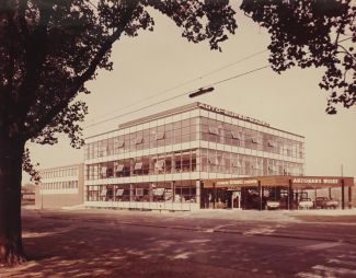 1961ff., Blick auf das ehemalige „Autohaus Wilke /Auto-Super-Markt“ in Dortmund, verso Stempel „Rolf Schmieding – Lichtbildner – Dortmund, Vinckestraße 6“, 23,5 x 29,5 cm, Passepartoutmontage, leicht verblichen