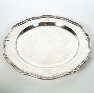 Manuf. Wilkens & Söhne/Bremen, Barockstil, runde Grundform, sechsfach passig geschweifter Profilrand, MZ, Beschau, ca. 770g 800er Silber, Dm. ca. 33 cm, im Boden Widmungsgravur