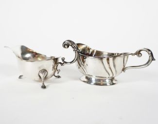 Konvolut von 2, England/Deutschland, 1x Barock Stil, 1x auf 3 Huffüßchen und C-Rocaillehenkel (von Kante gelöst), je MZ, Beschau, zus ca 170gr 925er Silber