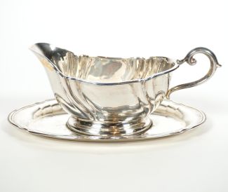 Manuf. Jakob Grimminger/Schwäbisch Gmünd, Barock-Stil, geschweift godronierte Wandung, MZ, Beschau, ca. 155g 835er Silber, ca. 16,5 x 10,8 x 6,7 cm