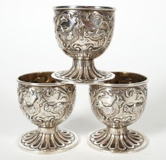 Konvolut von 3, Manuf Josef Oswald/Hanau, Barock Stil, reliefierte Wandung, dort Blüten sowie Rocaillereserven mit Hühnern, Reste von Innenvergoldung, H 5,5 cm, MZ, Beschau, zus ca 160gr 800er Silber