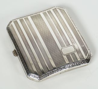 deutsch, rechteckige Grundform, Ecken abgeflacht, beidseitig guillochiert, leere Monogrammkartusche, Innenvergoldung, MZ, Beschau, ca 66gr 800er Silber, 8,5 x 7,5 cm, min Gebrauchsspuren
