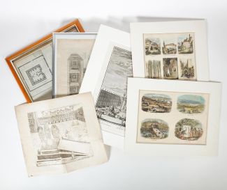 Konvolut von 6, 18./19.Jh., versch Techniken ua Kupferstich, bestehend aus: „Der zweite Tempel Zorobabels im Profil“, oben rechts paginiert, 26 x 20,5 cm, „Der Brand Opffers Altar“, oben rechts pag 138, 22,5 x 24,5 cm, J. G. Pintz: „Scenographia Atrii Sacerdotum“, Tab. CCCCLVII, 32 x 21 cm, Paar Ansichtssammlungen, koloriert, 28 x 20,5 bzw 20,5 x 28 cm und „Syria, Mesopotamia, Chaldaea“ mit Tempelgrundrissen, Blattmaß 29 x 37 cm, 3x Bugfalte, teils montiert, Lagerungsspuren, tlw gebräunt/fleckig (ex-Coll Crusius/Bremen)