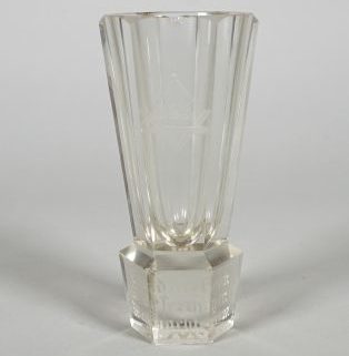 Anfang 20. Jh., farbloses Glas, in der Wandung Logenemblem sowie bez „Gewidmet von M. Wesermeyer. Weihnachten 1927“, im Boden „W“, H. 13,5 cm, 1x Chip an Lippe, kleinere Bestoßungen an Stand, Gebrauchsspuren (ex-Coll Crusius/Bremen)