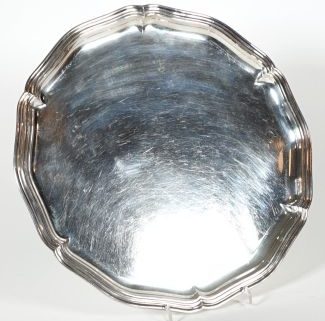 Manuf. Wilhelm Binder/Schwäbisch Gmünd, Barockstil, runde Form, sechsfach passig geschweifter Profilrand, MZ, Beschau, ca. 495g 835er Silber, Dm. 29,5 cm, Delle
