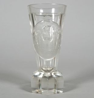 Ende 19. Jh., farbloses Glas, in der Wandung Freimaurersymbole und Eigentümermonogr AM sowie am Stand bez “ Br Aug Poetter s. l. Freunde und Br. A Müller zum Andenken an seine Meisterbeförderung September 1899″, gekugelter Abriss, H. 15,5 cm, min Gebrauchsspuren (ex-Coll Crusius/Bremen)