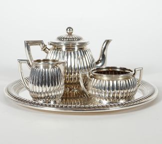 Manuf. Koch & Bergfeld/Bremen, 1910/20er Jahre, bombierte Kanne, umlaufend gordoniert, entspr. Klappdeckel, S-Tülle, J-Henkel, dazu Milchkännchen, Zuckerdose u. rundes Tablett, Dm. 26 cm, MZ, Beschau, zus. ca. 875g 800er Silber