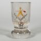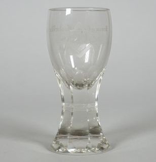 Ende 19. Jh., farbloses Glas, in der Wandung Freimaurersymbole sowie bez “ Meinem geliebten Bruder Ritzau z. Erg. A. d. 23/III.08. v. Br. Siegfried.“, gekugelter Abriss, H. 13,5 cm, min Gebrauchsspuren (ex-Coll Crusius/Bremen)