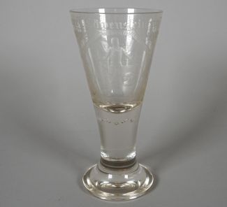 Anfang 20. Jh., farbloses Glas, wohl Glashütte Schorborn, in der Wandung Freimaurersymbole und Logenemblem „Joh. Loge Settegast zur deutschen Treue Breslau“ sowie bez „Ihrem lieben Bruder L. Löwenstein zum 75ten Geburtstage“, sign und dat A. Klose 1926, in Schaft 7 eingestochene Luftblasen, H 20 cm, min Gebrauchsspuren (ex-Coll Crusius/Bremen)