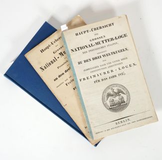 3 Bde., „Haupt-Übersicht der grossen National-Mutter-Loge der Preussischen Staaten, genannt Zu den Drei Weltkugeln (…)“, Berlin 1827/28, 1843/44 und 1853/54, 1x späterer Leineneinband, 2x Reste von Broschierung, ca 22 x 13 cm, 1x gebräunt/fleckig sowie Titelblatt gerissen, altersbedingte Lager- und Gebrauchsspuren (ex-Coll Crusius/Bremen)