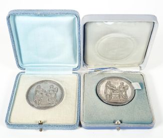 Zur silbernen Hochzeit, Konvolut von 2, Medailleur L. Chr. Lauer/Nürnberg, versilbert, Loge zur Hansa Bremen, Av. Paar vor Freimaureraltar, Umschrift Rv. Widmung „… Loge zur Hansa Bremen … Carl Friedrichs … 1917“ bzw. „… Bruder Bernhardt Denhardt … 1924“ im Kettenkranz, Dm ca. 4,5 cm, ca. 40,2 bzw. 41,2g, je in orig. Etui (ex-Coll Crusius/Bremen)