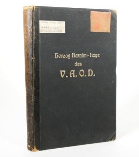 1904-32, Freimaurer, Herzog-Barnim-Loge des V.A.O.D./Stargard i Pommern, goldgeprägter Halbledereinbd., vorgedruckte Seiten für Aufnahme neuer Mitglieder bzw. Mitgliederliste, diese mit 128 Einträgen, ca. 74 Seiten handschriftlich gefüllt Januar 1904 – November 1932, restliche Seiten frei, ca. 33 x 22 cm, auf Titel Etikett „Herzog Barnim Loge Stargard Druiden Orden“ bzw. „… III.“, Gebrauchsspuren (ex-Coll Crusius/Bremen)