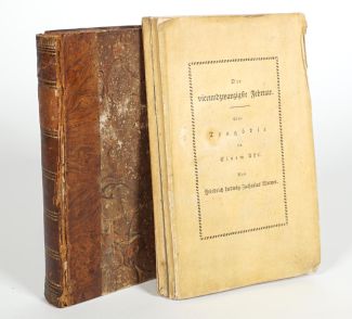 Friedrich Ludwig Zacharias, Konvolut von 2, Der vierundzwanzigste Februar. Eine Tragödie in Einem Akt, Vieweg/Braunschweig, 1815, 173 Seiten + Druckfehler, broschiert, 17 x 10,5 cm, Kanten verschmutzt/geknickt, Bindung in der Mitte gelöst und Die Söhne des Thal’s. Ein dramatisches Gedicht. Erster Theil. Die Templer auf Cypern, I.D. Sander/Berlin, 1807, 392 Seiten, Frontispiz und Titelvignette, goldgeprägter Halbledereinband (besch), 16,2 x 10,7 cm, Eigentümernachweis, altersbedingte Lagerungs- und Gebrauchsspuren (ex-Coll Crusius/Bremen)