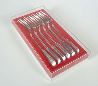 Satz von 6, Manuf Robbe & Berking/Flensburg, Spatendekor, MZ, Beschau, zus ca 295gr 800er Silber, orig Kasten (dieser mit Lagerungsspuren)