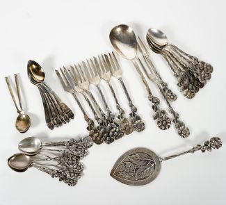 Art Hildesheimer Rose, bestehend aus: Gebäckheber, Sahnelöffel, 2 zweizinkige Gabeln, 6 Teelöffeln, 6 Kuchengabeln, 8 Mokkalöffeln, dazu 6 Teelöffeln mit Emaille-Wappen „Döbeln“, sowie Paar Löffelchen mit Kugelknäufchen, je MZ, Beschau, zus ca 545gr min 800er Silber