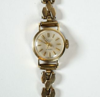 Manuf DuBois et fils/Basel, 1960er Jahre, 333er Uhrgehäuse und -gliederarmband, Uhrboden Metall, 17 rubis, Kronenaufzug, rundes Zifferblatt, goldfarbene Strichindices, entspr Zeiger,Faltschließe, L. 19 cm, MZ, Beschau, ca 16,02gr total, Werk läuft an, Glas verkratzt