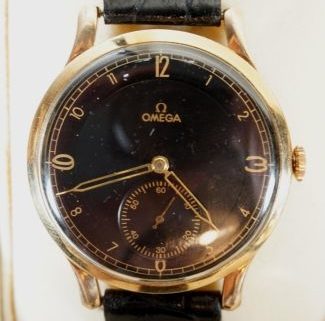 Herst. Omega/Biel, 1940er/50er-Jahre, Handaufzug, 585er-Gelbgoldgehäuse, schwarzes Zifferblattt, Goldzeiger, Strich- u arabische Indices, dezentrale Sekunde, Dm ca. 4,5 x 4 cm, MZ, Beschau, total ca. 41,2g, Werk läuft an, späteres Lederarmband