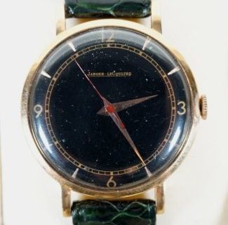 Herst. Jaeger LeCoultre/Le Sentier, Handaufzug, 750er-Gelbgoldgehäuse, schwarzes Zifferblattt, Goldzeiger, Strich- u arabische Indices, num. 306465 A, ca. 4,3 x 3,5 cm, MZ, Beschau, ca. 40,8g total, Werk läuft an, späteres Lederarmband