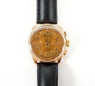 Mauf. Dulfi/La Chaux-de-Fonds, Chronograph, 750er Gelbgoldgehäuse, 17 Rubis, Inkabloc, Antimagnetic, 2 Totalisatoren, arabische Indices, vergoldetes Zifferblatt (Gebrauchsspuren), Kronenaufzug, Werk läuft, Flyback funktionstüchtig, Schweizerbeschau, späteres Lederarmband