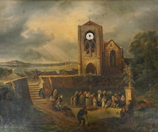 späte Biedermeier Epoche, Öl/Lw., Beerdigungsszene vor gotischer Kirche mit Blick auf weite Flusslandschaft, im Turm Emaillezifferblatt, röm Indices, gebläute Zeiger, orig klappbarer Goldstuckrahmen auf originalem konischem Holzkasten, dort Messingplatinenwerk (wohl später), Halbstundenschlag auf Klangspirale, Pendel fehlt, Maße über alles 18 bzw 9,5 x 87,5 x 74,5 cm, Malerei: Krakelee, restauriert, Rahmen mit Beschädigungen
