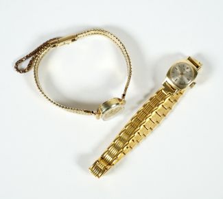 Herst Dugena/Meisenheim, 1960er Jahre, 585er-Uhrgehäuse und -flechtarmband, Kronenaufzug, rundes Zifferblatt (dieses berieben), Goldzeiger und -strichindices, Faltschließe mit Sicherheitskettchen, MZ, Beschau, ca 17,55gr Gold (ohne Werk, mit Glas gewogen), Werk läuft an dazu DAU, Herst Ankra, 585er-Uhrgehäuse, vergoldetes Armband, Eigentümergravur, MZ, Beschau, ca 26,6gr total