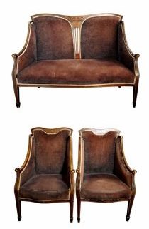 Frankreich, 1910er-Jahre, 2-Sitzer u Paar Bergères, meist Nußbaum, geschweifte Rückenlehne mit Festonintarsie u Bandeinlagen, entspr. Armlehnen u Frontbeine, allseits gepolstert, ca. 100 x 120 x 58 bzw. 2x 98,5 x 56 x 60 cm, unrestauriert, teilweise stärkere Gebrauchsspuren, alte u abgenutzte Polsterung