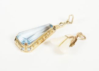 Konvolut von 2, Anhänger- bzw. Rahmen 585er-Gold, bestehend aus: Anhänger m trapezförmigem Aquamarin, L ca. 3 cm und Grandelanhänger, 1x MZ, je Beschau, zus. ca. 12,35g total, L über alles ca. 5,5 bzw. 3 cm