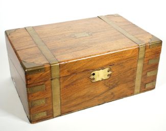 Viktorianische Epoche, Nussbaum, rechteckiger klappbarer Kasten, Messingbänder u. Eckbeschläge sowie leeres Monogrammschild, schräge Schreibplatte als Doppelplatte mit goldgeprägtem Leder, gefacht, ca. 15 x 35,5 x 23 bzw. 47 cm, Gebrauchsspuren