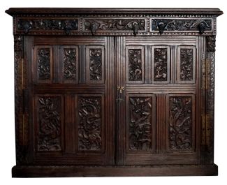 Victorianische Epoche, Neogotik, Eiche, dunkel gebeizt, rechteckig kragende Platte, umlaufend Flachschnitzerei einer Floralbordüre, enstpr. bearbeitete Front u Seiten, 3 Schübe mit Drachen u vollplastische Holzknäufe in Form von Fledermäusen, in den Kanten Maskerons u Schuppenband, 2 Türen, mehrfach kassetiert, meist Drachen, mythologische Wesen u Floraldekor, orig. Messingscharniere u -beschläge, 1 Schloss mit Schlüssel (defekt), unrestauriert, im Basisbereich teilweise leicht verblichen, ca. 107 x 135 x 38,5 cm
