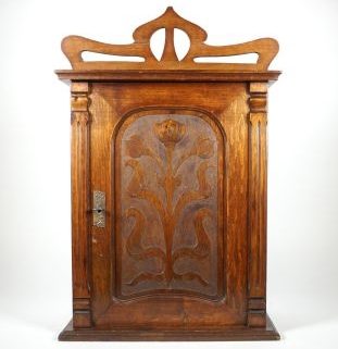 Jugendstil-Epoche, diverse Hölzer, nußbaumfarben gebeizt, hochrechteckiger Kasten, entspr., Fronttür mit Kassette, dort florale Flachschnitzerei, Schlüssel mit Schloß, orig. Bekrönung, ca. 61 x 40,5 x 21,5 cm