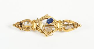 Victorianische Epoche, in den Spitzen Perlchen u stilisierte Blumen, durchbrochen gearbeitet, zentral Kranz mit Blatt, stilisierte Blüte mit Perlchen u stilisierte Blüte mit ovalem Saphir in Krappenfassung, MZ, Beschau, ca. 3,4g 375er-Gold total, L ca. 4,5 cm