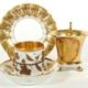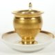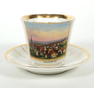 Thüringen/Böhmen, Biedermeier Epoche/1. Hälfte 19. Jh., zentral in Wandung feine Malerei von Bad Freienwalde, reiche Goldverzierung, entspr Untere, Porzellanmanuf Krister, Streifendekor, Tasse 8 x 11 x 9 cm bzw Untere Dm 14,5 cm, je min berieben (Tasse stärker)