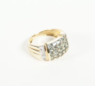 verlaufende Schiene, gerillte Schulter, dort je vier Diamantsplitter, zentral Kissen mit Blautopase in Pavéfassung, MZ, Beschau, ca 6,05gr 585er Gold total, Ringgröße 57
