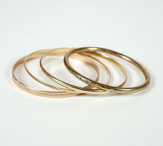 Konvolut von 4, versch Dekore, 1x guillochiert, 2x glatt, Dm. ca 6,7 cm, zus ca 27,94gr 333er Rot- und Gelbgold, 1x gedellt