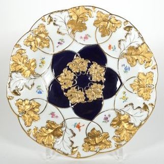Staatl Porzellanmanuf Meissen, polychromiert, reichvergoldet, poliert/matt, Flachrelief Weinlaubdekor, Streublümchen, Dm. 28 cm, blaue Schwertermarke unter Glasur, 1. Wahl, minimalst berieben