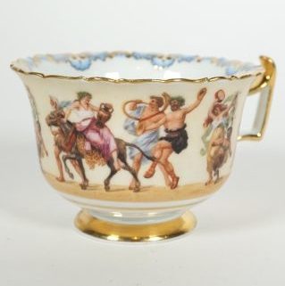 Königl. Porzellanmanufaktur Meissen, Biedermeier-Epoche, gestauchte Glockenform, Reliefrand in gold und blau (kl. Chip), in der Wandung polychrome Malerei, Triumphzug des Bacchus, blaue Schwertermarke unter Glasur