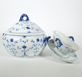 Porzellanmanuf Bing & Gröndahl/Kopenhagen, Dekor Sommerfugl/Schmetterling, Seepferdchen als Griffe, 24 x 33 x 27 bzw 10,5 x 23 x 14 cm, je grüne Stempelmarke unter Glasur, Terrine und Deckel je ein Schleifstrich