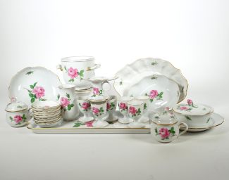 Staatl Porzellanmanuf Meissen, Dekor Rote Rose, meist Form Neuer Ausschnitt, goldsilhouettiert, bestehend aus: längsrechteckige Kuchenplatte 39 x 15cm, Übertopf H. 10,5 cm, Rechaud mit Metallaufsatz, 6 Eierbecher, Butterschale mit Deckel, runde Schale Dm 18 cm, zwei Rautenschalen, Tischväschen H. 11 cm, Kerzenleuchter, zwei Lady Curzon-Tassen und 9 Teebeutelschälchen, je blaue Schwertermarke unter Glasur, 5x 1. Wahl sonst 2 Schleifstr