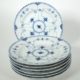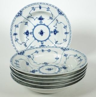 Satz von 6, Porzellanmanuf Royal Copenhagen, Dekor Musselmalet Halbspitze, Dm. 23,5 cm, je blaue Wellen- und grüne Stempelmarke unter Glasur, Modellnr 659, je 1. Wahl