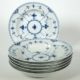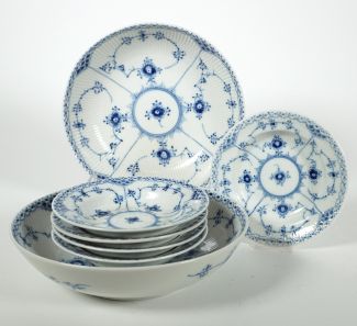 Porzellanmanuf Royal Copenhagen, Dekor Musselmalet Halbspitze, bestehend aus: 5 Schälchen Dm. 14,5 cm, und zwei Servierschalen Dm. 21,5 cm, je blaue Wellen- und grüne Stempelmarke unter Glasur, Modellnr 569 und 512, 1x ein Schleifstr sonst 1. Wahl