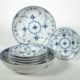 Porzellanmanuf Royal Copenhagen, Dekor Musselmalet Halbspitze, 16 x 27 x 19,5 cm bzw 30 x 23 cm, je blaue Wellen- und grüne Stempelmarke unter Glasur, Modellnr 622 und 532, je 1. Wahl, tlw Gebrauchsspuren