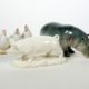 Porzellanmanuf Royal Copenhagen, pastellfarben, Zwei Enten, eine Gans auf Naturplinthe und ein Kükenpaar, H 5 bis 9,5 cm, je blaue Wellen- und grüne Stempelmarke unter Glasur, Modellnr 1924, 1934, 1192 und 363, je 1. Wahl